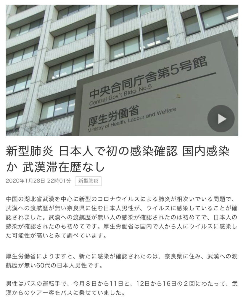 NHK NEWS WEB 『新型肺炎 日本人で初の感染確認 国内感染か 武漢滞在歴なし』より引用