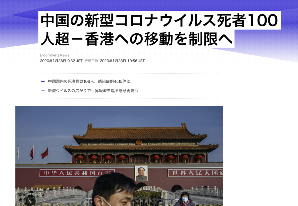 Bloomberg 『中国の新型コロナウイルス死者100人超-香港への移動を制限へ』より引用
