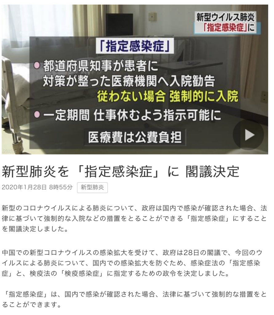 NHK NEWS WEB 『新型肺炎を「指定感染症」に 閣議決定』より引用