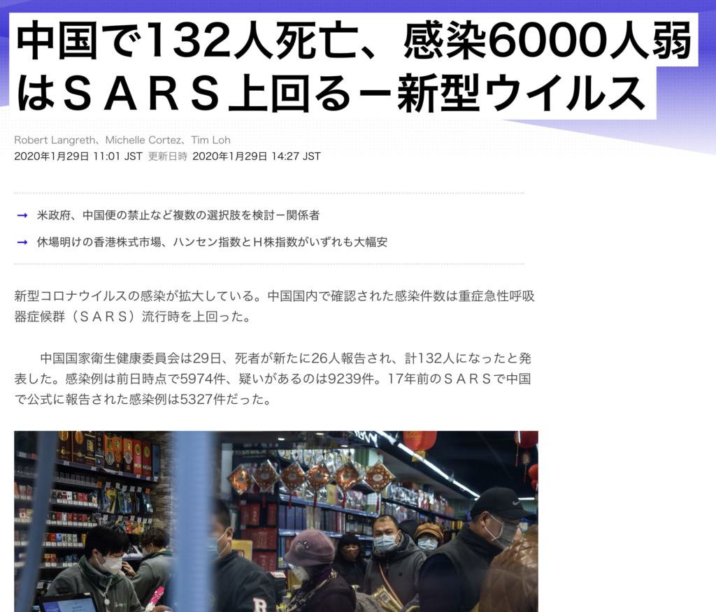 Bloomberg 『中国で132人死亡、感染6000人弱はSARS上回る-新型ウイルス』より引用