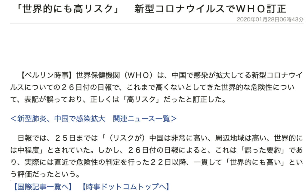 そしてWHOは新型コロナウイルスの世界リスクを「中程度」と記載してたんですが、実は誤りで「高リスク」でした。
