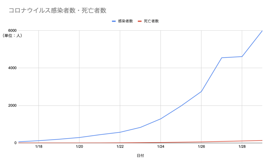 こちらが感染者・死者数のグラフですが、指数関数的に増えていることが分かると思います。