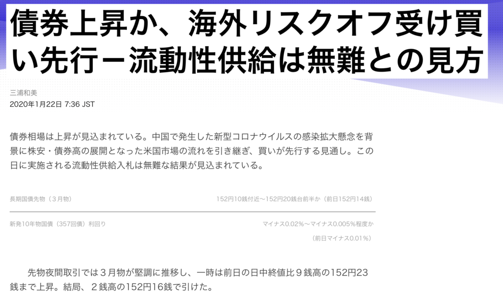 Bloomberg 『債券上昇か、海外リスクオフ受け買い先行-流動性供給は無難との見方』より引用