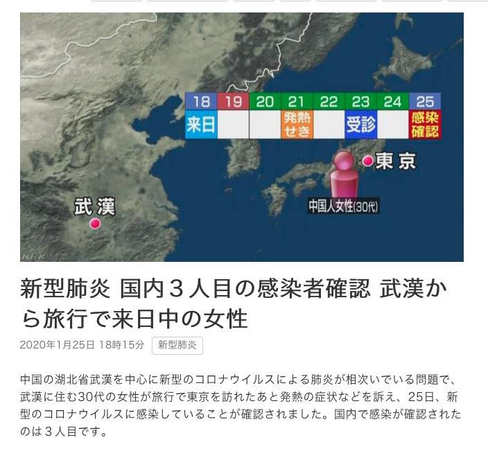 NHK NEWS WEB 『新型肺炎 国内3人目の感染者確認 武漢から旅行で来日中の女性』より引用