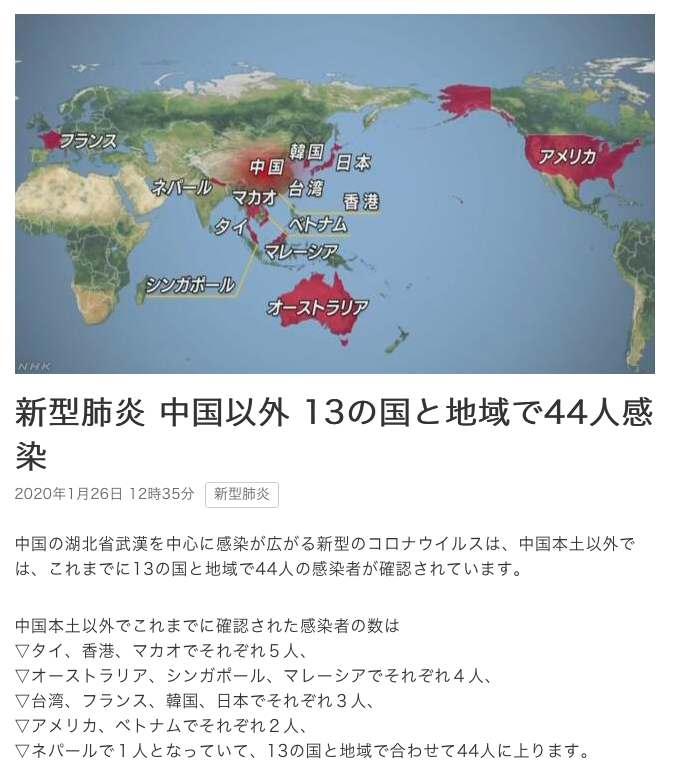 NHK NEWS WEB 『新型肺炎 中国以外 13の国と地域で44人感染』より引用
