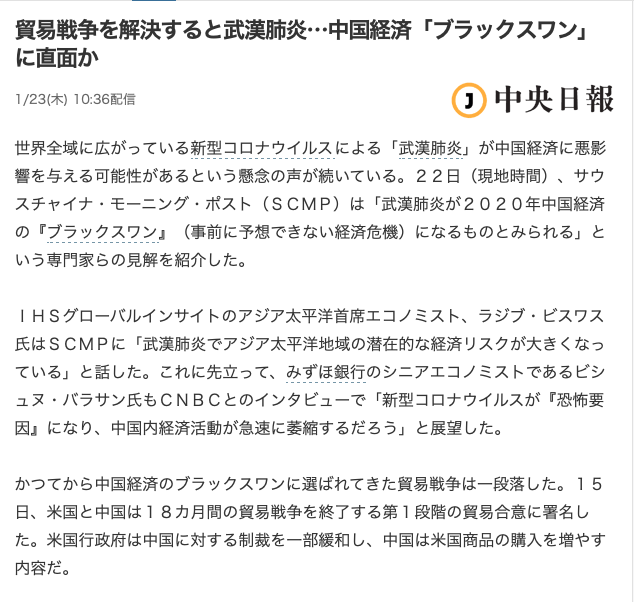 YAHOO! JAPANニュース 『貿易戦争を解決すると武漢肺炎…中国経済「ブラックスワン」に直面か』より引用