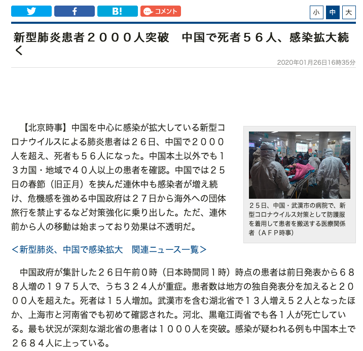 時事ドットコム『新型肺炎患者2000人突破 中国で死者56人、感染拡大続く』より引用