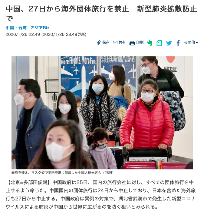 日本経済新聞『中国、27日から海外団体旅行を禁止 新型肺炎拡散防止で 』より引用