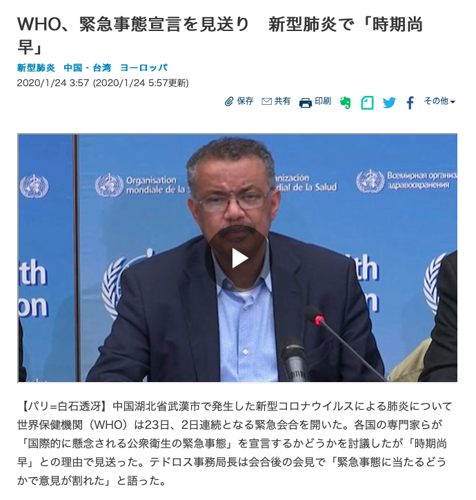 日本経済新聞 『WHO、緊急事態宣言を見送り 新型肺炎で「時期尚早」 』より引用