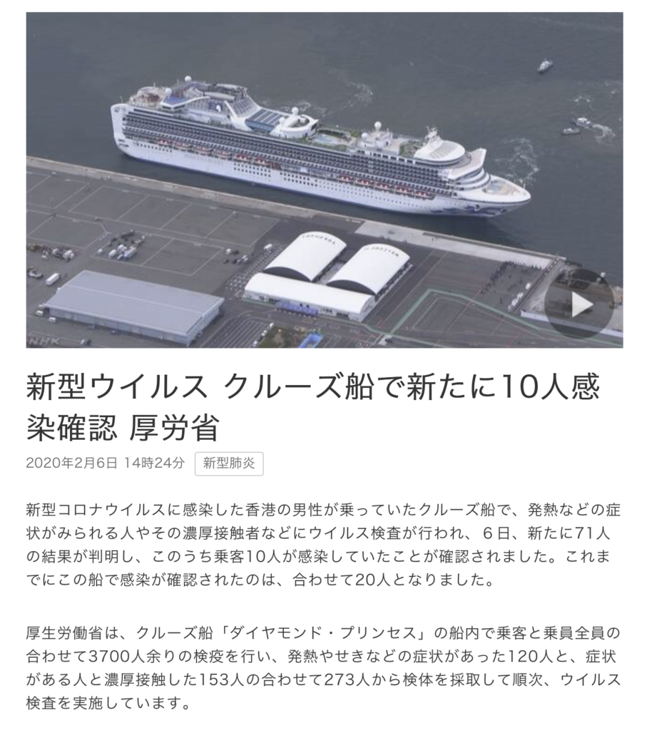 NHK NEWS WEB『新型ウイルス クルーズ船で新たに10人感染確認 厚労省』