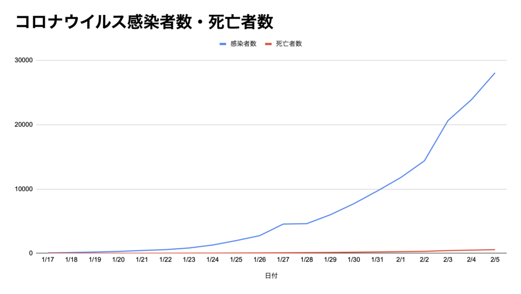 こちらが中国本土の新型コロナウイルス感染者・死者数のグラフですが、指数関数的に増えているのがわかると思います。