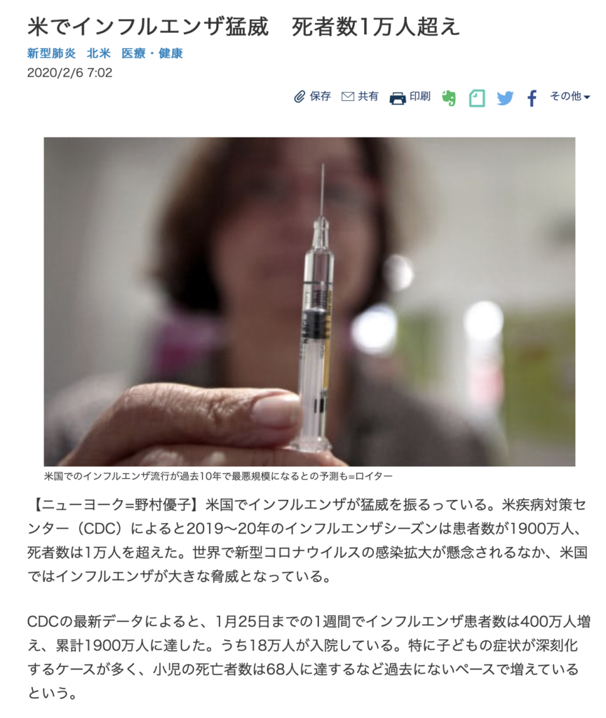 日本経済新聞『米でインフルエンザ猛威 死者数1万人超え』より引用