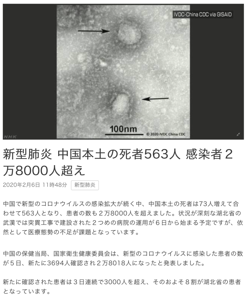 NHK NEWS WEB『新型肺炎 中国本土の死者563人 感染者2万8000人超え』