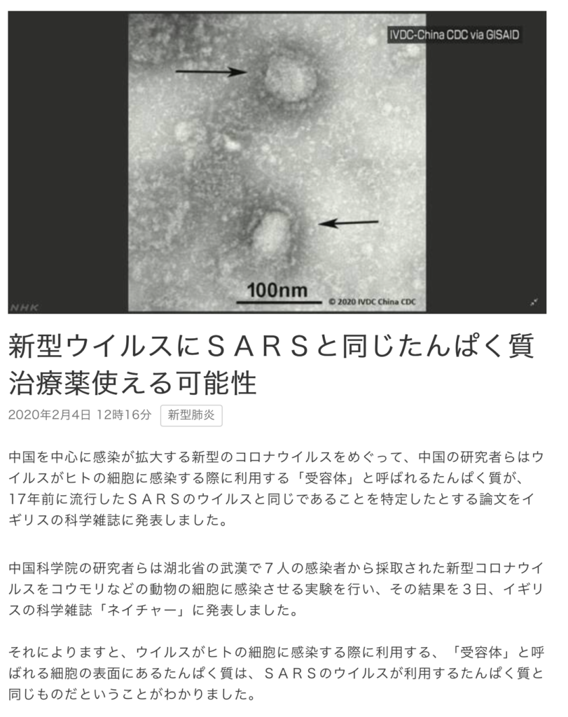 NHK NEWS WEB『新型ウイルスにSARSと同じたんぱく質 治療薬使える可能性』より引用
