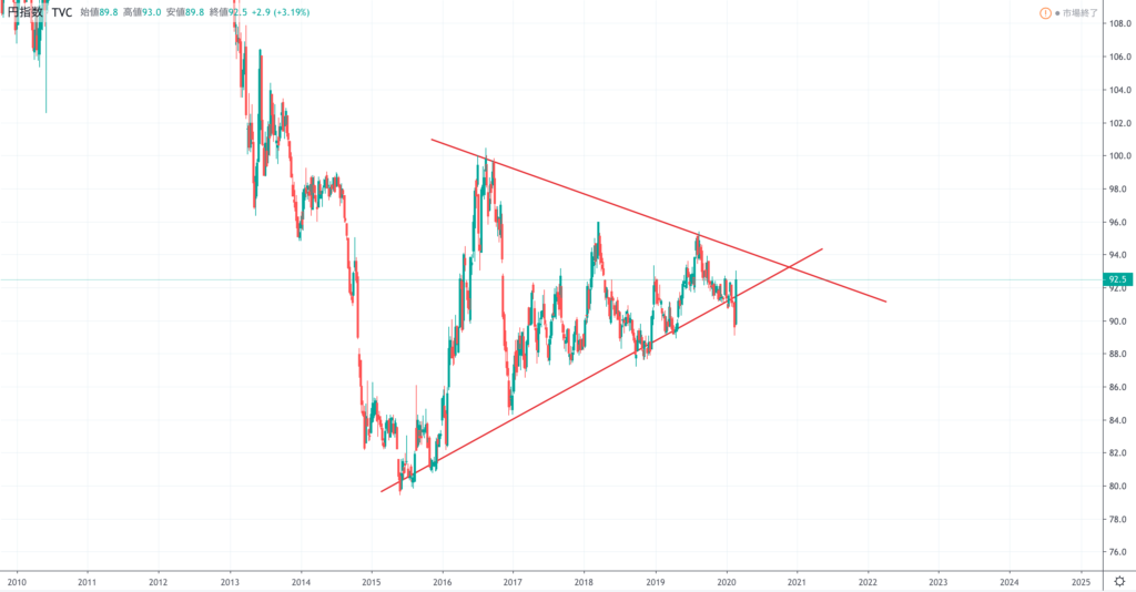 円指数は三角持ち合いを下抜けしたあと、また持ち合いの中に入っています。