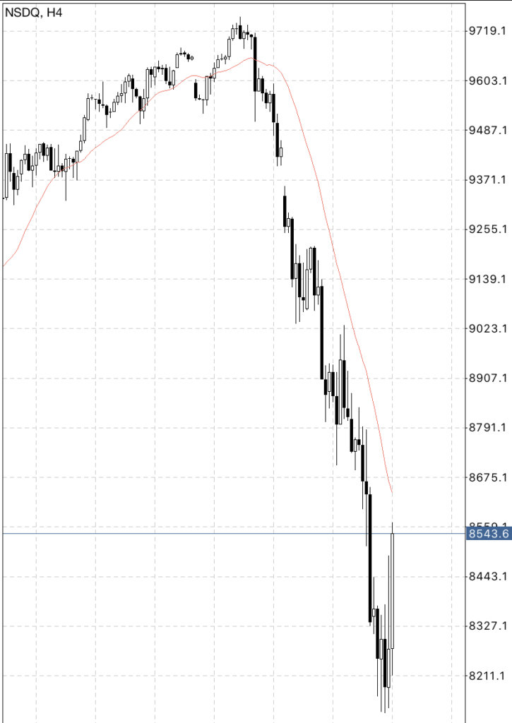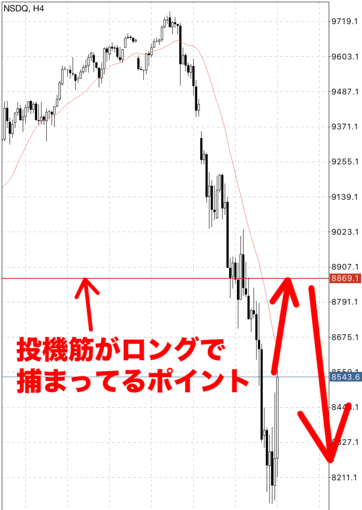 アメリカ株ナスダックは下図の8869の線で、投機筋や機関投資家の買いポジションが捕まってる可能性があります。
