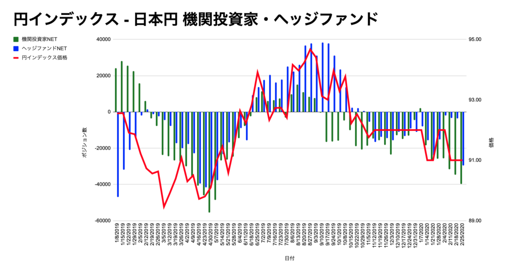 こちらが円インデックス(円指数)の価格と、円の投機筋(大口筋・小口筋)・機関投資家・レバレッジファンドのポジション数になります。