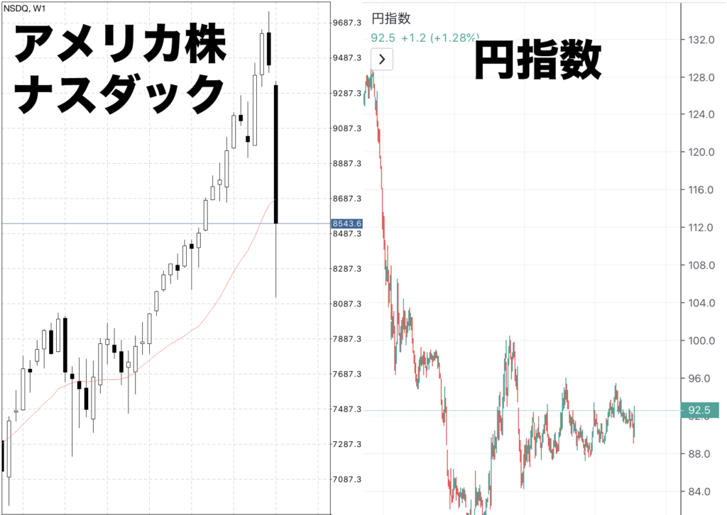 実際にここから見ると、アメリカ株ダウ・SP500とアメリカ株ナスダックの綱引きと考えることができます。