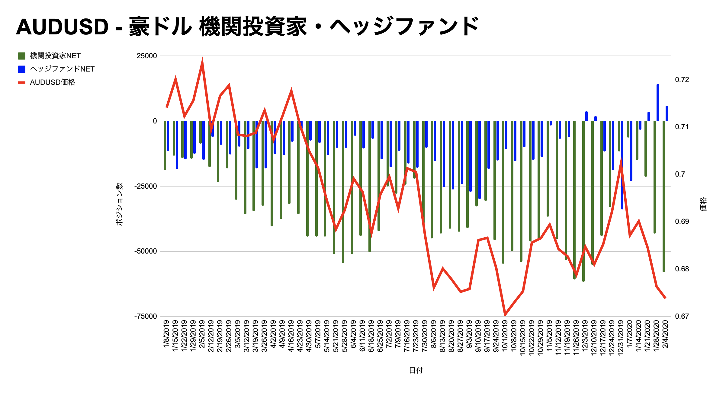 こちらがAUDUSDチャートと、豪ドルの機関投資家とレバレッジファンドのポジション量です。