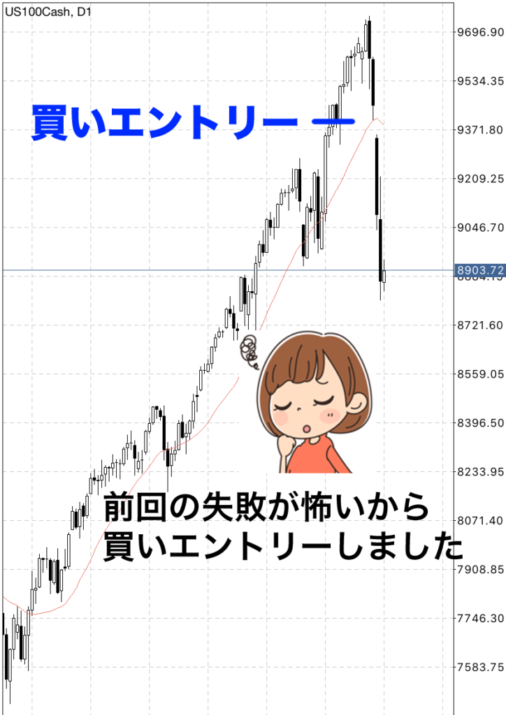 大衆トレーダーの大部分は前回の失敗を気にするあまり「前に売りで失敗したから買いにしよう」と自分のスタイルを変えていきます。
