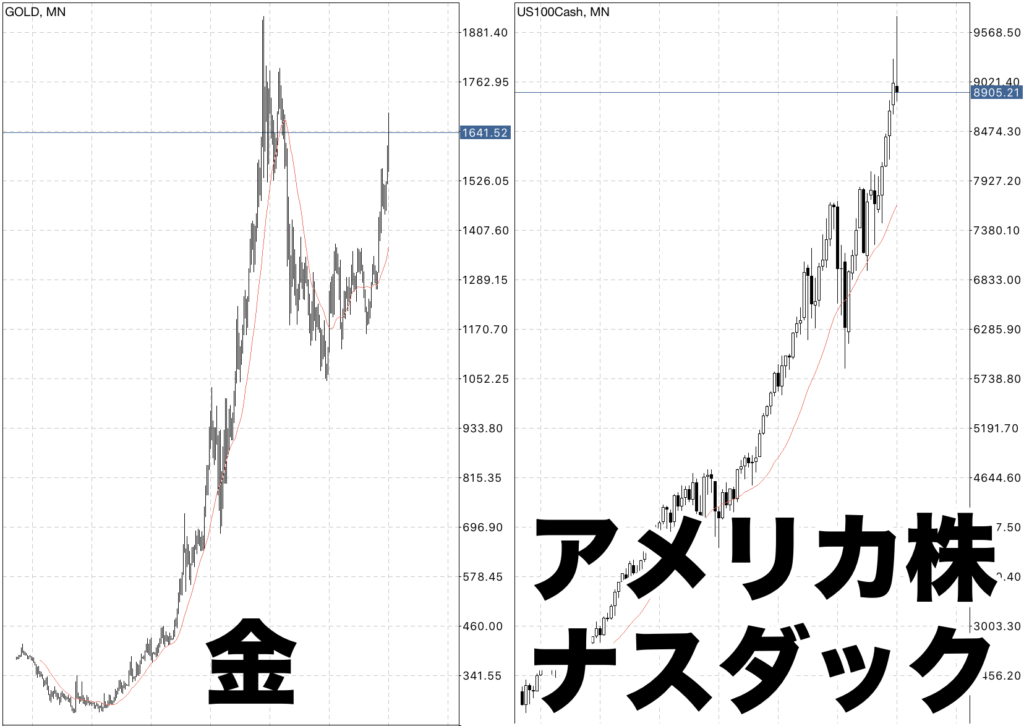 その通りです。さらに金は過去に最高値が存在していますが、アメリカ株ナスダックは今が最高値という状況でした。