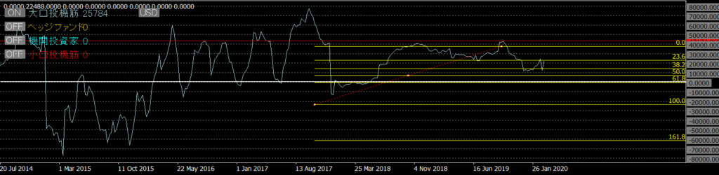 投機筋チャートには投機筋(大口筋・小口筋)、機関投資家、レバレッジファンドのポジション量を表示します。