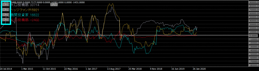 投機筋チャートとは大口投機筋・機関投資家・レバレッジファンドの「相場を操る御三家」のポジション量をまとめたチャートになります。