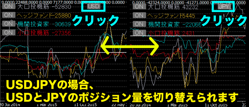 ①投機筋・機関投資家・レバレッジファンドの表示・非表示を切り替えられる。