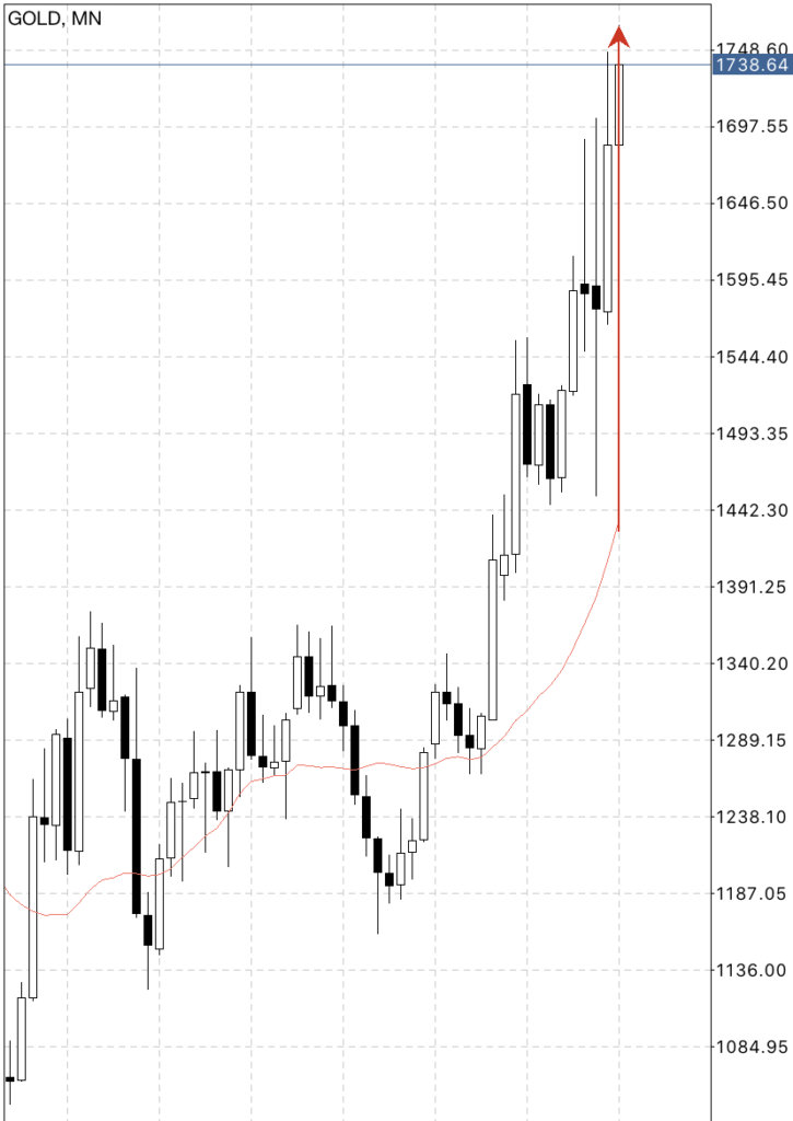金は月足でも移動平均線から離れているので、修正として落ちたとしても大きな値幅は狙えると見込んでいます。