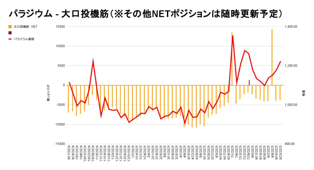 パラジウムの投機筋チャートでは、買いポジション数が一気に減少してからほとんどポジション数が無い状態です。