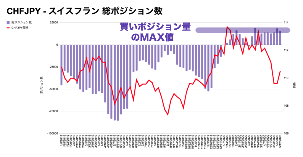 スイスフランは買いの総ポジション数がMAXになってきているのがわかると思います。