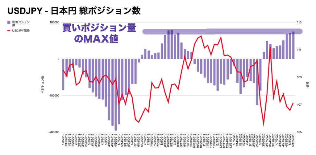 機関投資家が一気に買いポジション数を増やしていますが、実は総ポジション数ではMAX値にきています。