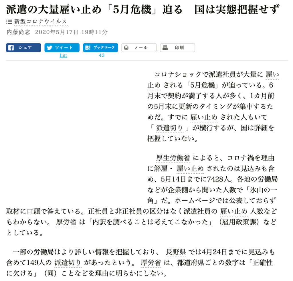 朝日新聞DIGITAL『派遣の大量雇い止め「5月危機」迫る 国は実態把握せず』より引用