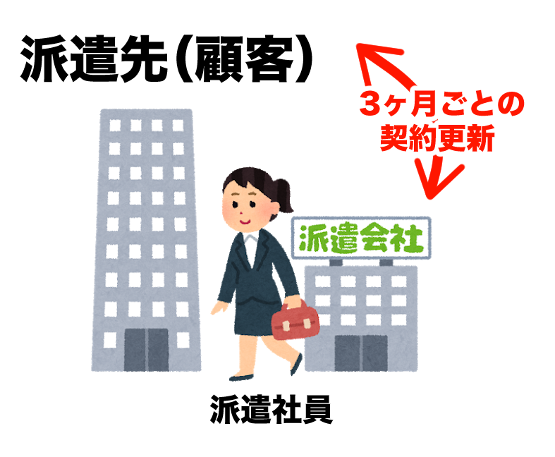 派遣社員の場合、派遣元が派遣先(顧客)と3ヶ月毎の契約で仕事をする形になります。