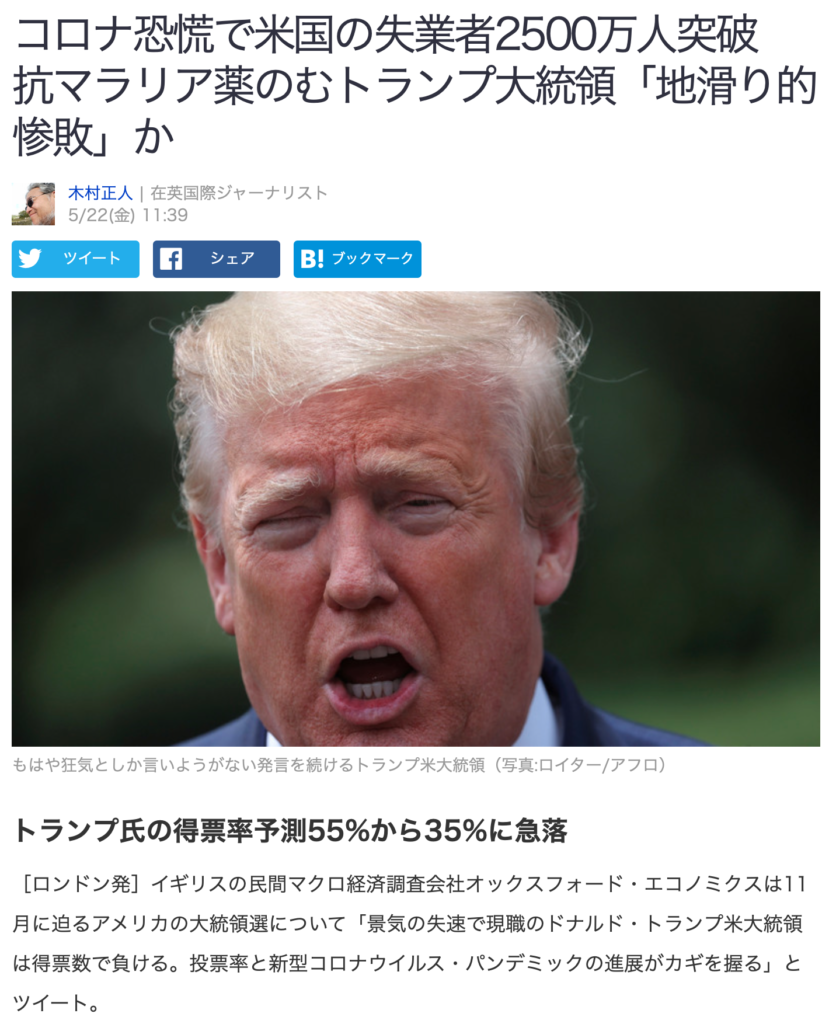 Yahoo!ニュース『コロナ恐慌で米国の失業者2500万人突破 抗マラリア薬のむトランプ大統領「地滑り的惨敗」か』より引用