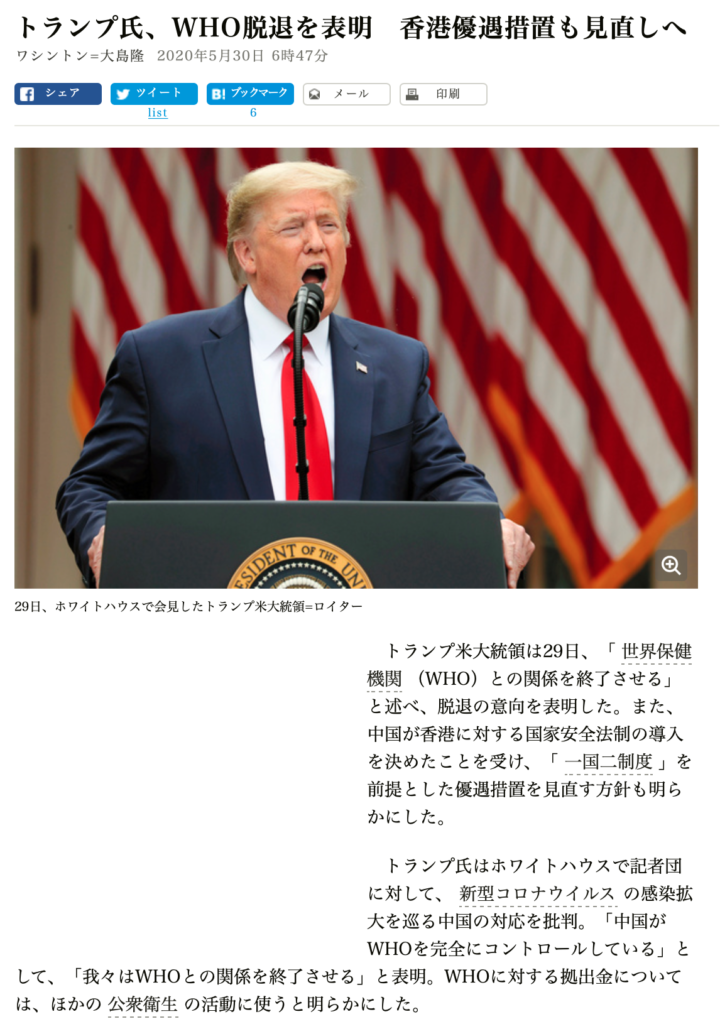 しかし5月下旬に、トランプ大統領は「WHOと中国は癒着している!WHO脱退して、さらに香港の優遇措置も取り消すぞ!」と言いました。