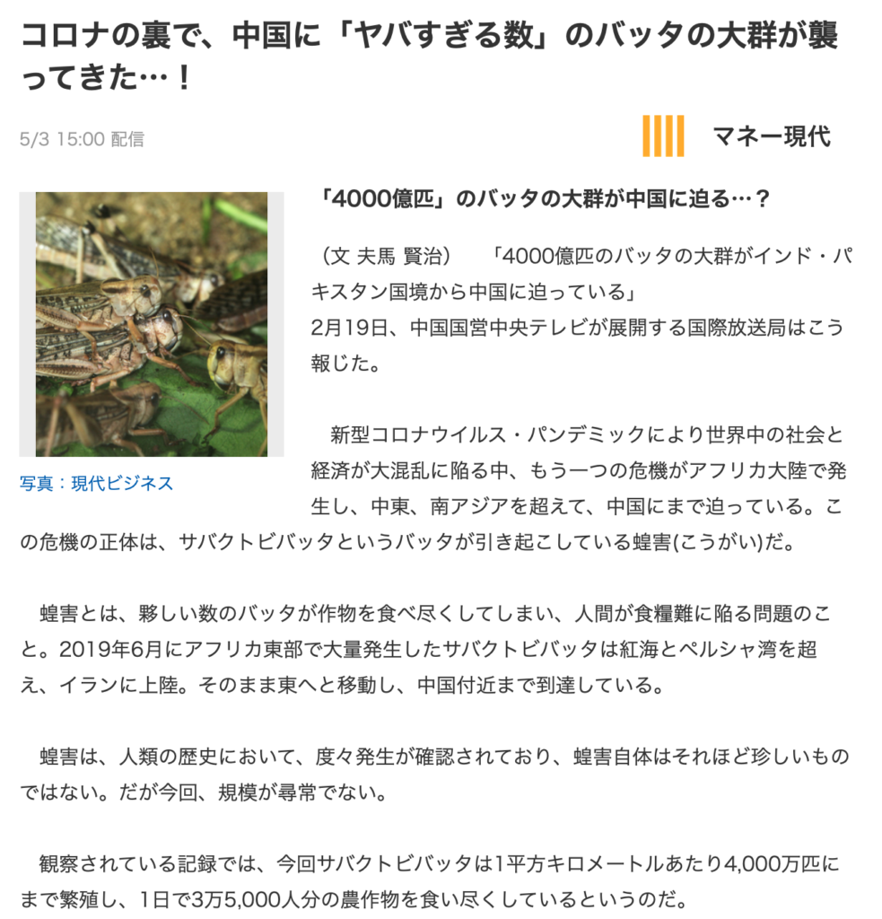 YAHOO!ファイナンス『コロナの裏で、中国に「ヤバすぎる数」のバッタの大群が襲ってきた…!』より引用