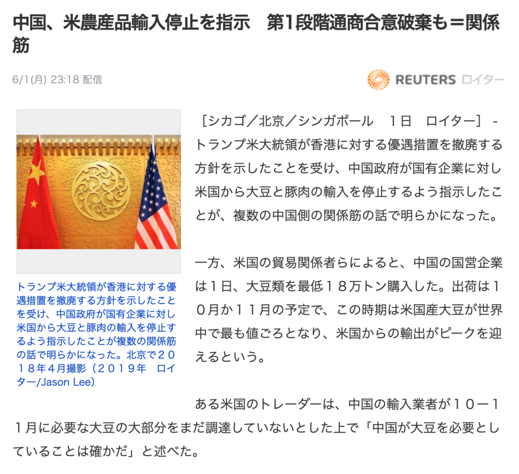 YAHOO!JAPANニュース『中国、米農産品輸入停止を指示 第1段階通商合意破棄も=関係筋』より引用