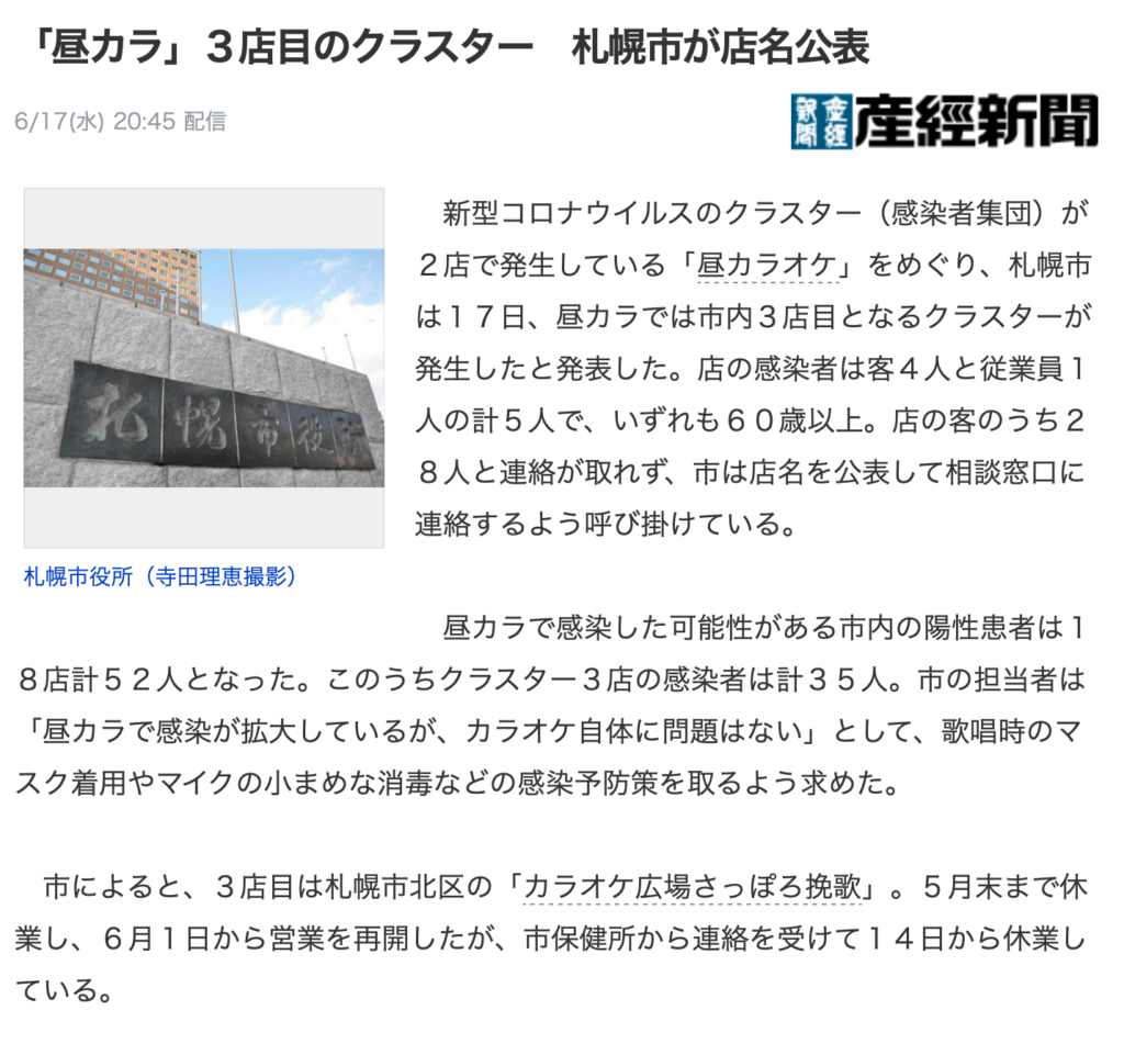 YAHOO!JAPANニュース『「昼カラ」3店目のクラスター 札幌市が店名公表』より引用