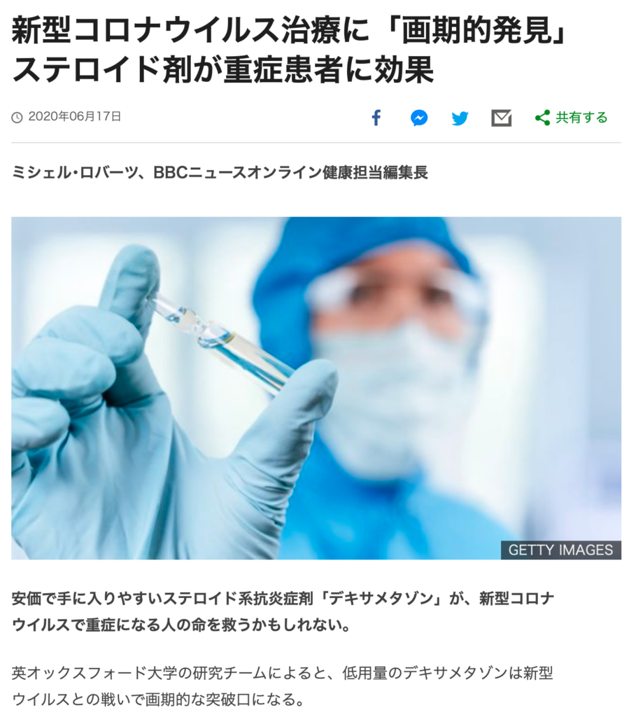 BBC NEWS JAPAN『新型コロナウイルス治療に「画期的発見」 ステロイド剤が重症患者に効果』より引用