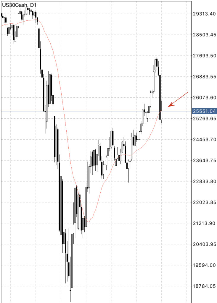 カナエさん、こんにちは!ダウ平均株価は日足の移動平均線に当たってきていますね。