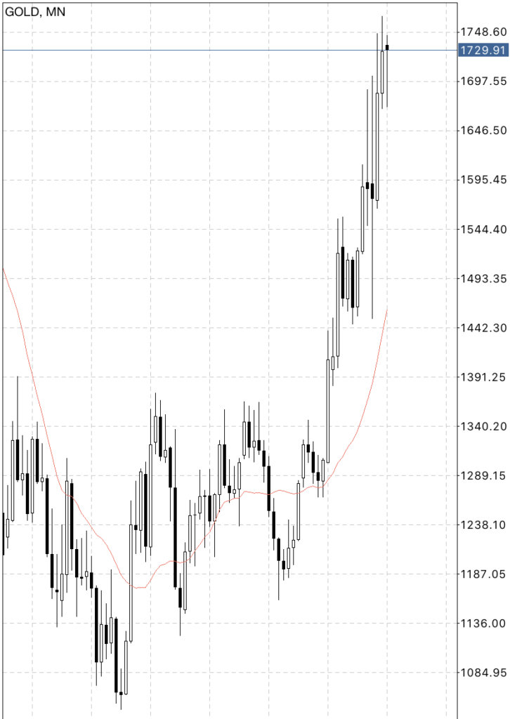 あと金は月足で移動平均線から大きく離れています。