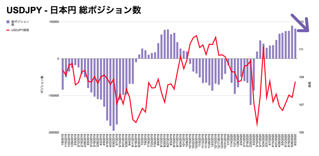 円の買いポジション量はすでにMAXだったので、そこから全体的に売りに転じたと見ることもできます。
