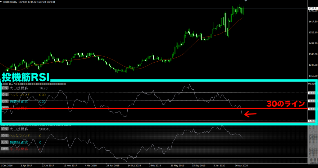 実は投機筋RSIで金をみると、なんと大口投機筋のRSIが30以下で売られすぎになっているんです。