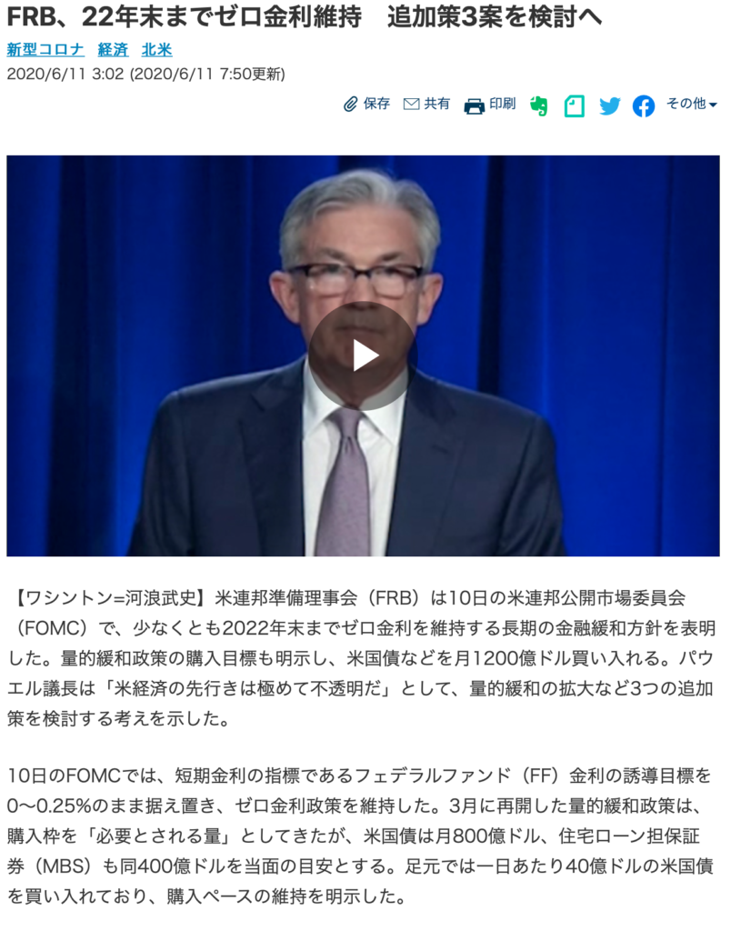 日本経済新聞『FRB、22年末までゼロ金利維持 追加策3案を検討へ』より引用