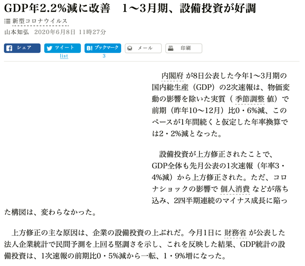 朝日新聞DIGITAL『GDP年2.2%減に改善 1~3月期、設備投資が好調』より引用