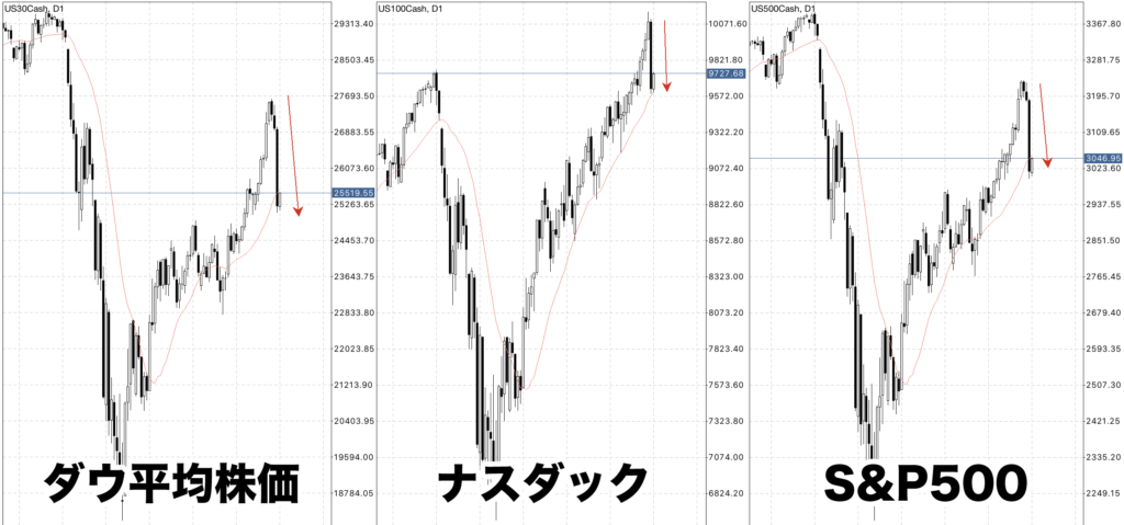 現在、アメリカ株は全体的に日足の移動平均線に当たってきています。