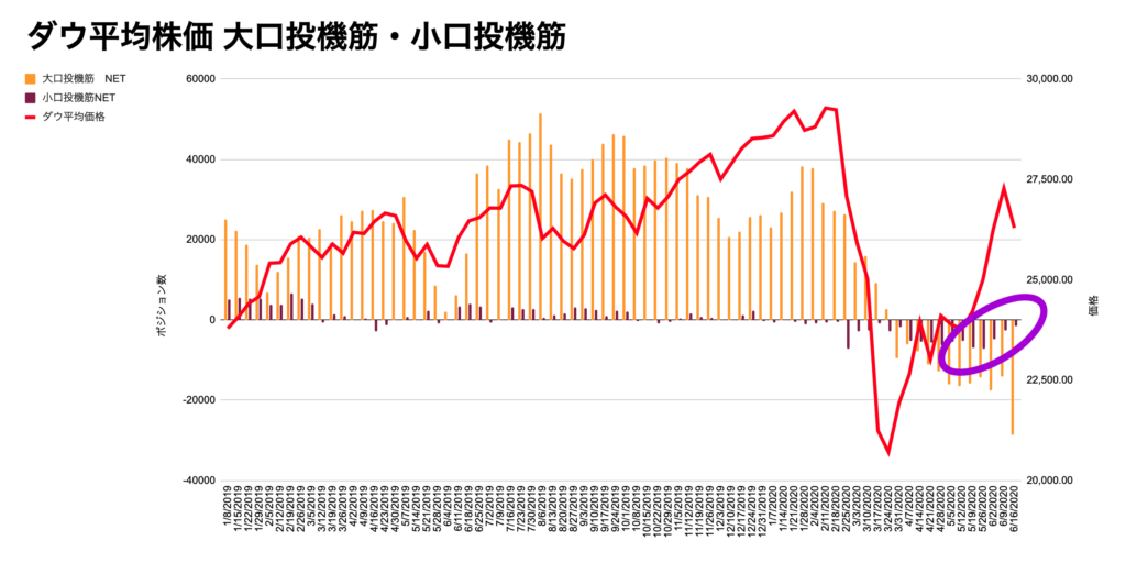 あれれ・・・・?大口投機筋と小口投機筋の動きがダウ平均株価と逆ですよ!?