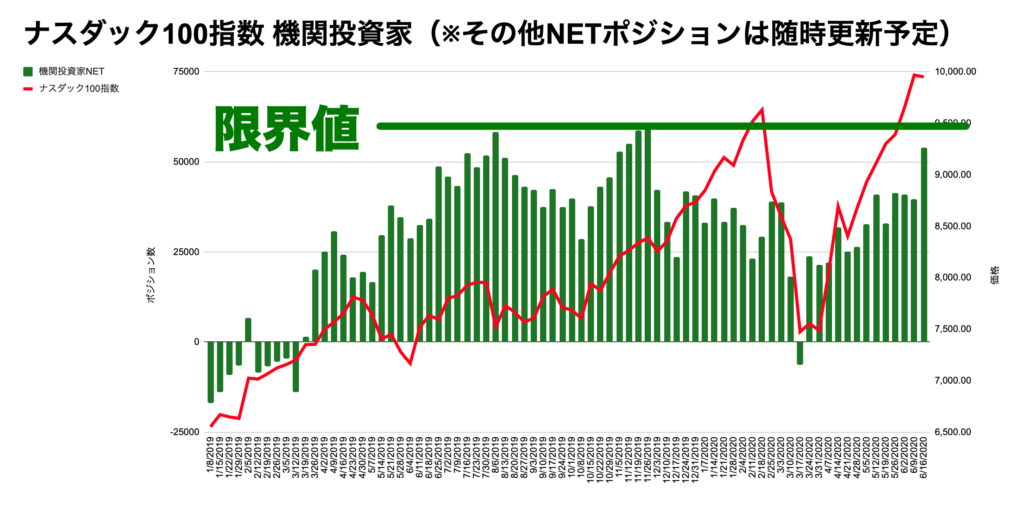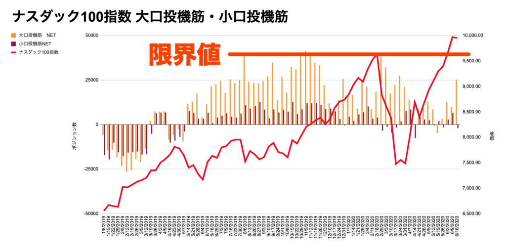 一方でナスダックは大口投機筋・機関投資家ともに買いポジション量の限界値までまだ伸びしろがあります。