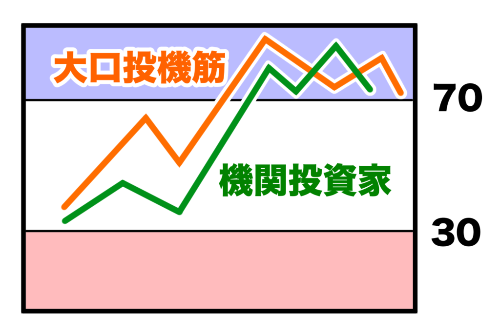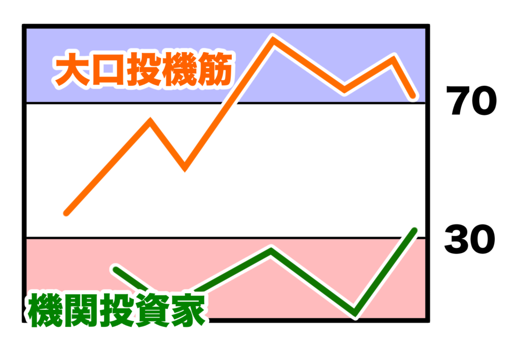 たとえば大口投機筋のRSIが買われすぎだけど機関投資家のRSIが売られすぎの場合、全体的に拮抗していることがわかります。